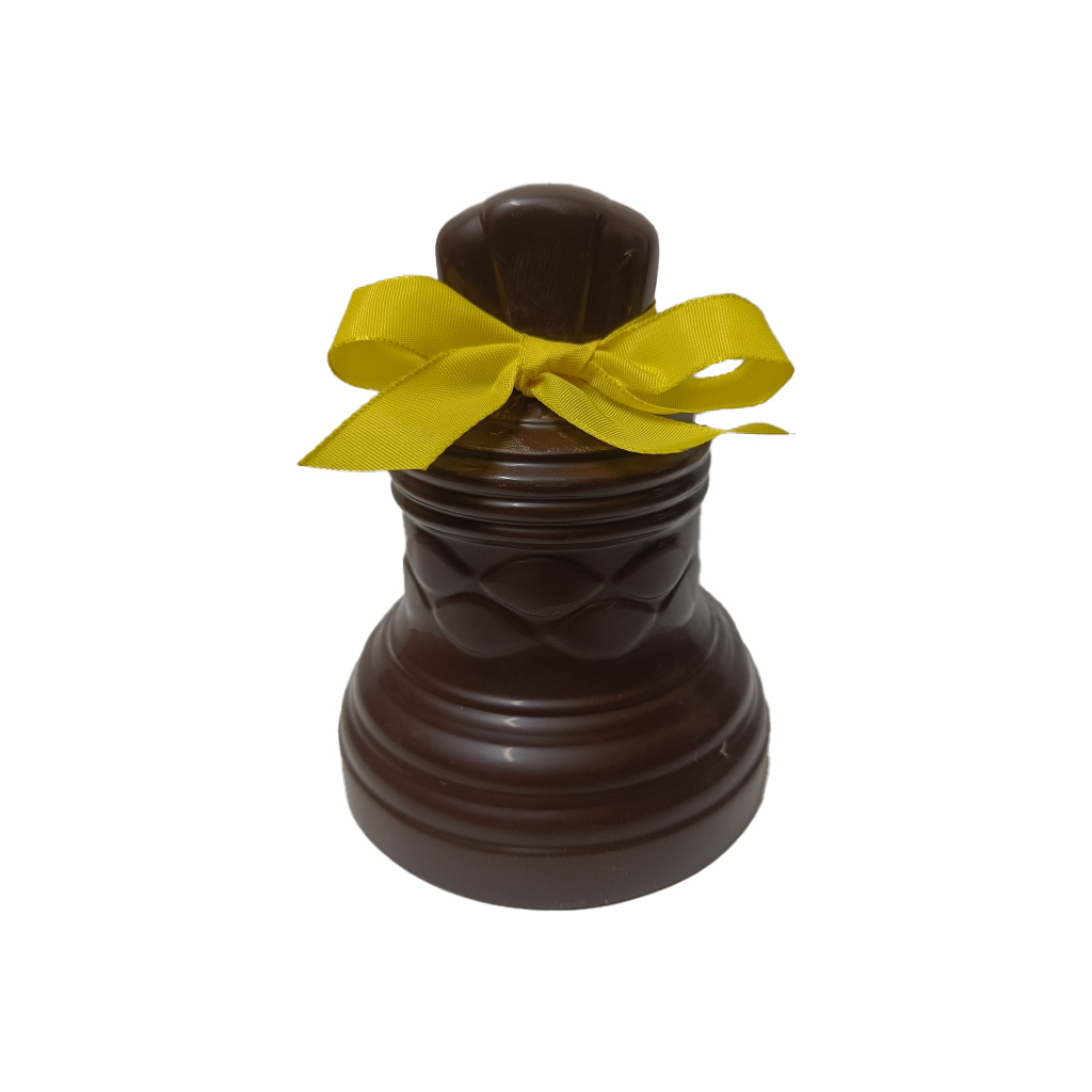 Cloche en chocolat noir ou lait au choix, garnie de fritures de chocolat noir ou lait et d’œufs feuilletés pralinés.