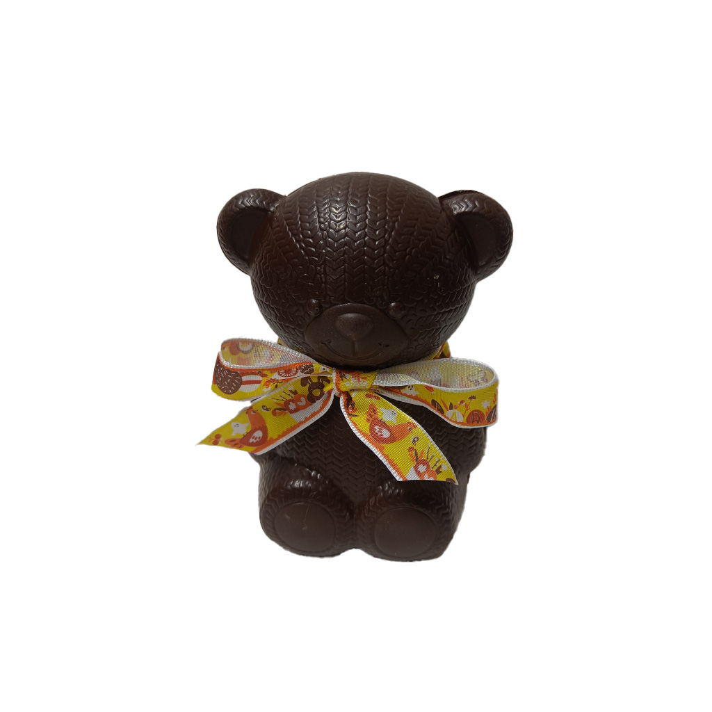 Ours tricot en chocolat noir ou lait, garni de fritures de chocolat noir ou lait et d’œufs feuilletés pralinés.